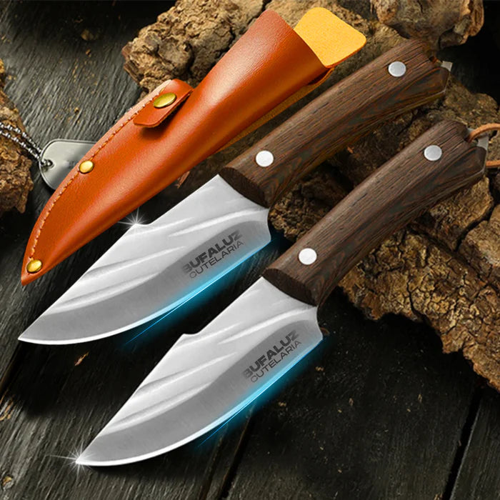 As Facas Cactus Bufaluz™ são escolhidas por quem exige desempenho de verdade. Cada lâmina é forjada à mão, garantindo um corte preciso, durabilidade extrema e um visual rústico incomparável. Nesta oferta exclusiva, você leva 2 facas artesanais + bainha de couro pelo preço de uma. Uma oportunidade rara de ter qualidade premium no seu kit.