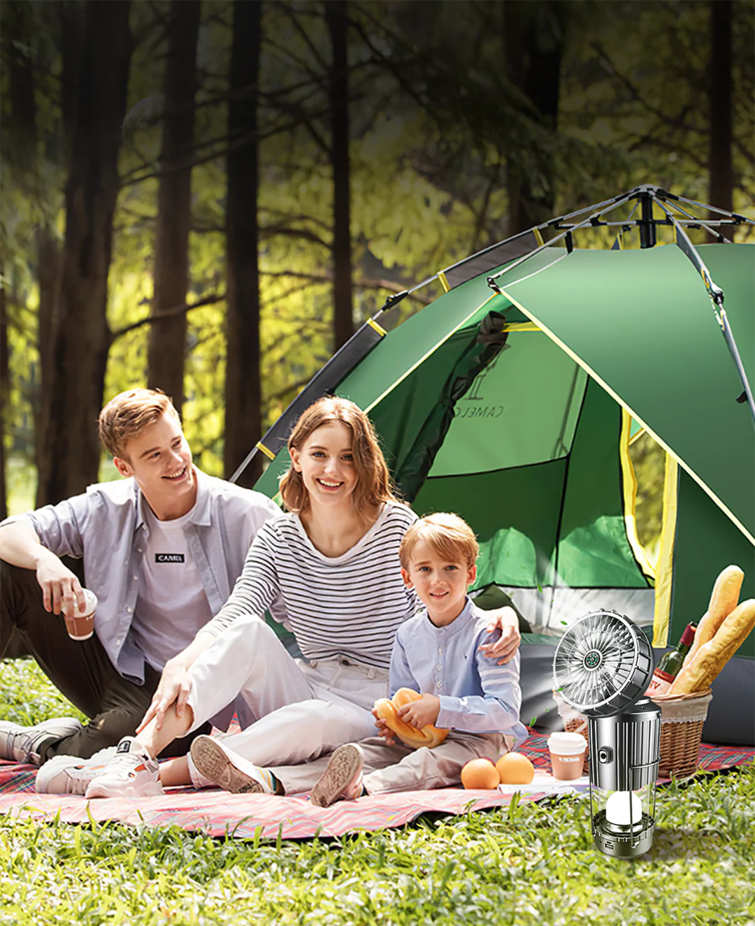 Não importa se você está em um acampamento, em casa durante uma falta de luz ou simplesmente relaxando no quintal. O LUMIFAN™ funciona como ventilador, lanterna LED, lâmpada ambiente e ainda carrega seus dispositivos.