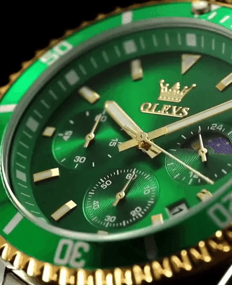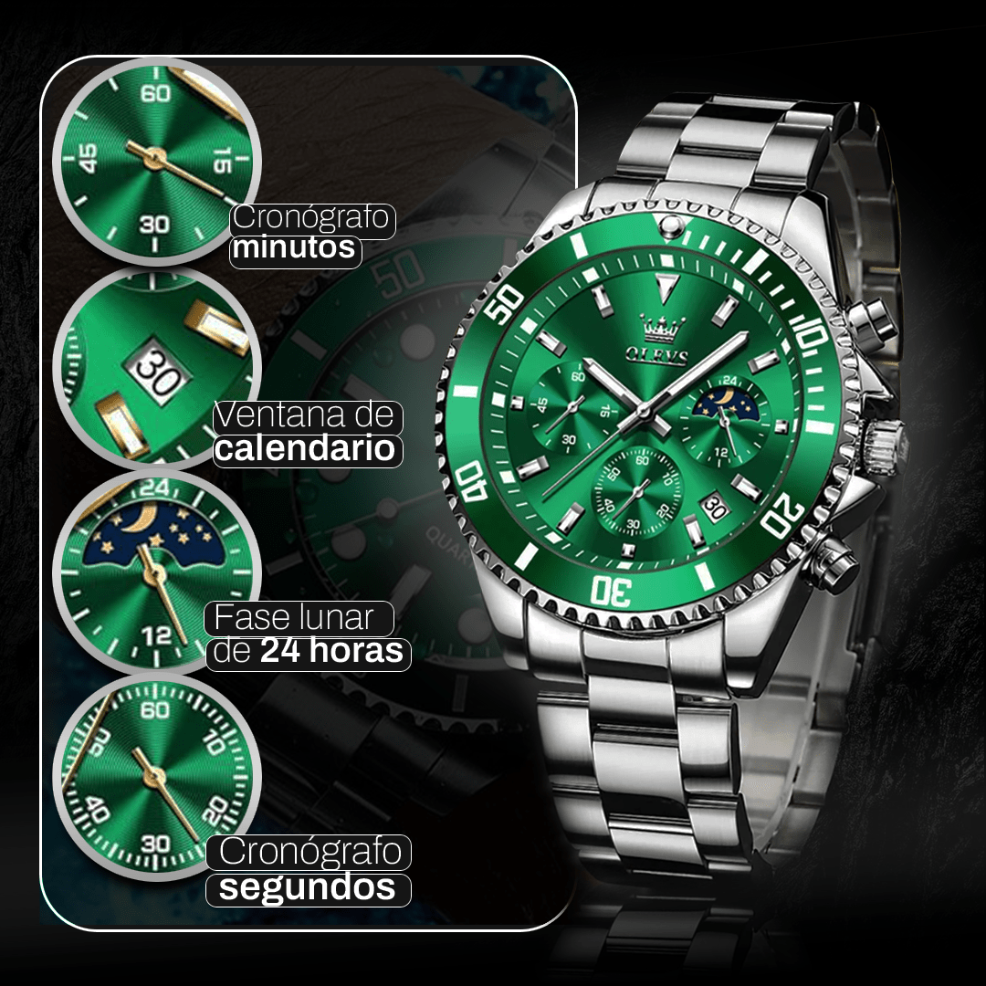 Equipado com cronógrafo de alta precisão e calendário lunar, este relógio vai além do básico. Cada detalhe foi pensado para oferecer praticidade e exclusividade no seu dia a dia.