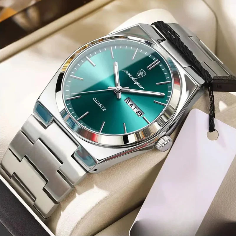 Su acabado en acero inoxidable y esfera verde degradada lo convierten en una pieza moderna y sofisticada, ideal para cualquier ocasión: negocios, eventos o uso diario.